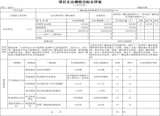 按照《省财政厅关于加强2025年预算绩效管理工作的通知》(黔财绩〔2025〕1号)要求,贵州省广播电视局(以下简称“省广电局”)于2025年2月19日至2025年5月15日对2024年贵州省广电传媒事业发展专项资金开展了项目绩效评价,现就评价情况报告如下: